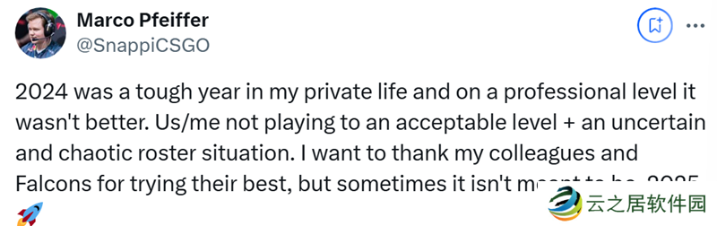ENCE时期的精彩发挥。0.85的平均rating和无缘Major赛事让他在Falcons战队的经历颇为惨淡,最终他在11月底被队伍下放。Snappi也在社交平台上写道:“无论是个人生活还是职业生涯。2024年对我来说都很艰难。我们和我个人的比赛表现未达可接受水平,而且阵容情况也充满混乱和不确定性。我要感谢我的队友以及Falcons战队尽了最大努力,但有些事有时就是事与愿违。2025年冲冲冲。”