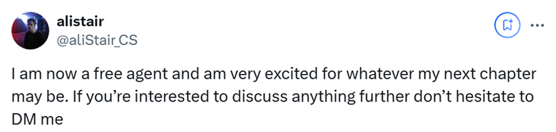FlyQuest战队在社交平台上宣布同aliStair解约。随后aliStair在社交平台上发布动态,公开寻求offer。