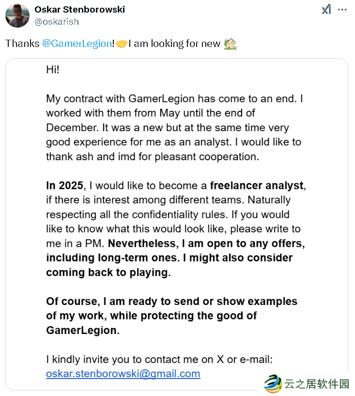 您好!我与GamerLegion的合同已结束,我从5月工作到12月底。作为一名分析师,这段经历对我来说既是新的挑战,也是非常好的体验。我想感谢ash和imd的协作。2025年,我希望能继续担任分析师,如果有哪个团队对此感兴趣,我自然会遵守所有保密规则。我对任何报价都持开放态度,包括长期合作的机会。我也可能考虑重返职业选手的行列。当然,我随时准备向您展示我的工作示例,同时会保护GamerLegion的利益。