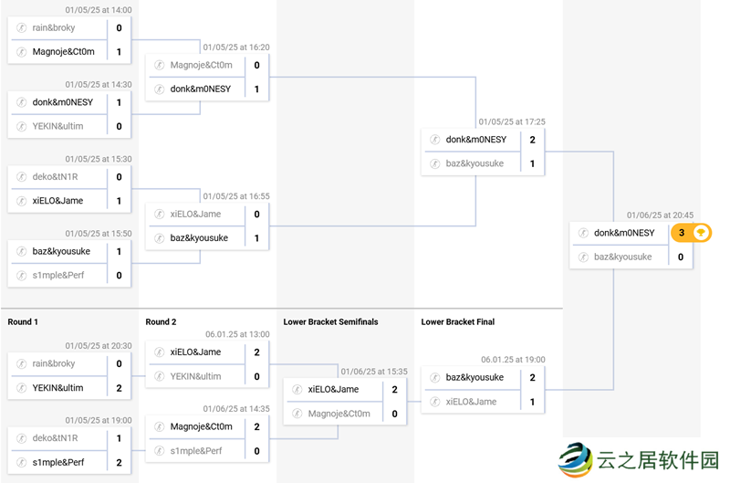 donk和m0NESY的队伍赢得了12万美元奖金,donk还被选为MVP,此外,donk和m0NESY还因刀杀各获得了5000美元奖励。baz和kyousuke的队伍获得亚军,赢得了6万美元。