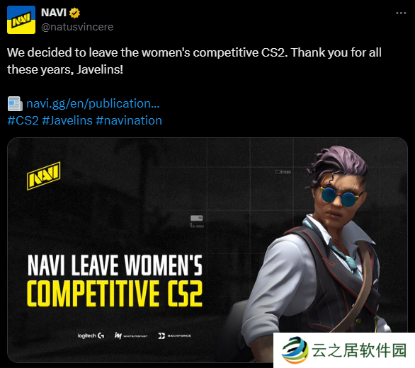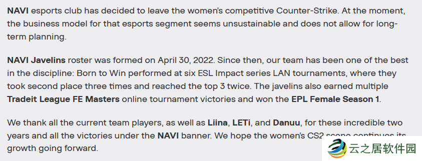“NAVI电子竞技俱乐部已决定退出女子反恐精英竞技项目。目前,该电竞领域的商业模式似乎难以为继,无法进行长期规划。
