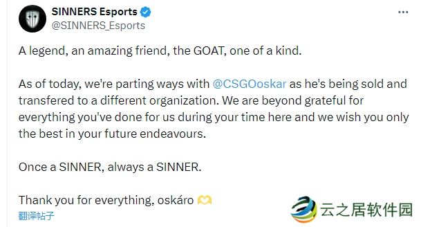 “非常感谢你在这里的努力与贡献。祝愿你未来一切顺利,”SINNERS在社交平台上表达了对oskar的感谢。