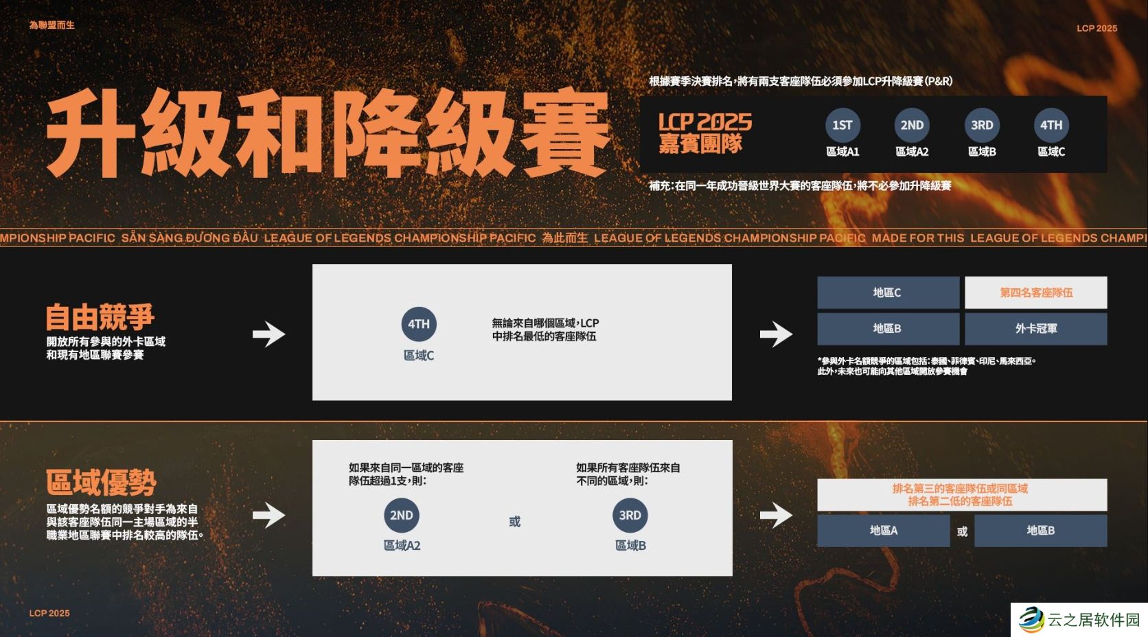 在自由竞争(FFA)后,第二支参加升降级赛的LCP客座队伍,将根据以下优先顺序来争夺区域优势名额: