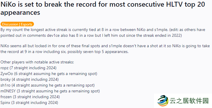 Falcons战队选手NiKo即将打破连续入围HLTV年度最佳选手TOP20的最高纪录,目前最长的连续入围记录是由NiKo和s1mple两人并列的连续8次。(编者注:正如其他人在评论区中指出,device也有连续8次,但由于他的连胜记录已经在2022年结束,所以编者将他排除在外)