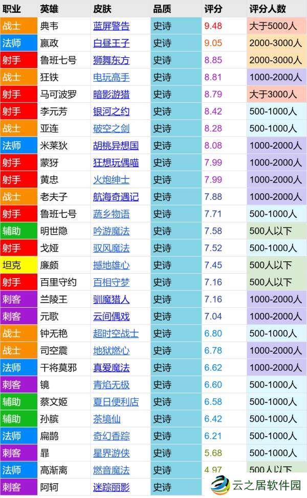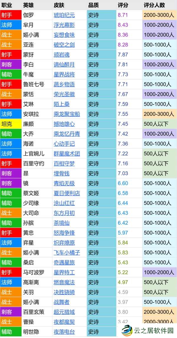 目前孙膑评分最好的史诗皮肤还是虎年限定。茶境仙的评分和KPL史诗非常接近。
