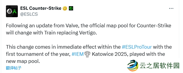 这一变化立即生效,将在#ESLProTour中实施,2025年首场赛事IEM 卡托维兹将使用新的地图池进行比赛。”