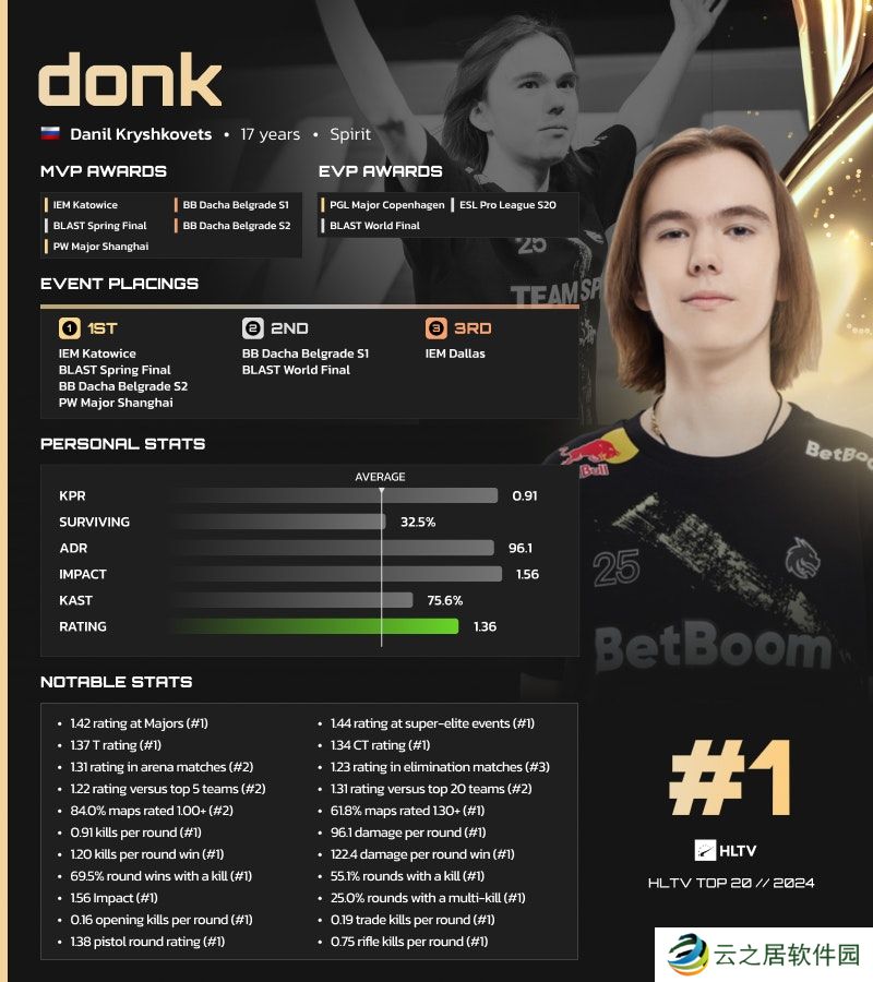 donk巩固了他作为CS历史上最伟大新秀之一的地位,并复刻了ZywOo在2019年的壮举,在他作为一线职业选手的第一个完整年登顶HLTV的Top20选手榜单。