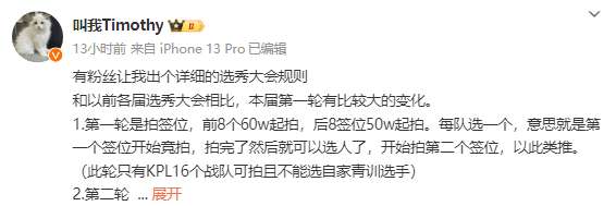 2.第二轮起拍疑似涨价50w,这轮也是只能选一个选手,没有拍签位。(此轮K甲也不可以参与竞拍且可以拍自家青训选手,KPL+2个临时席位参与竞拍,可以弃选)倒序是一年的综合成绩。如果第二轮自家选手有其他队伍出价,则母队放弃出价,失去竞价权。