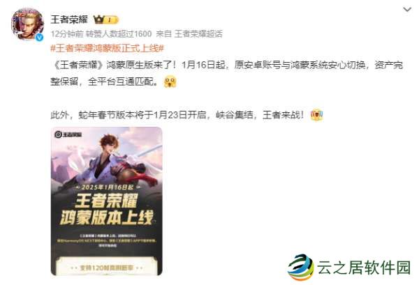 《王者荣耀》鸿蒙原生版来了!1月16日起,原安卓账号与鸿蒙系统安心切换,资产完整保留,全平台互通匹配。
