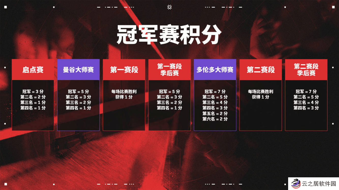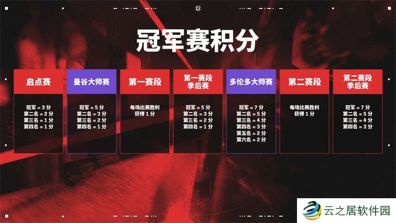 和去年一样,冠军赛积分将分配至每个赛段和比赛中。我们的目标是确保赛季的每个部分都具有挑战性,且不会沦为鸡肋。为此,我们做出了两项重要改动:让大师赛和季后赛的积分分配更具有深度,并使各个赛段独立,为所有队伍在赛季中期提供新的起点。