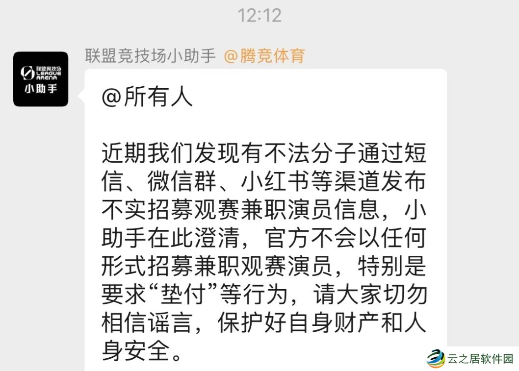 今日联盟竞技场小助手发布信息,澄清招募演员:近期我们发现有不法分子通过短信、微信群、小红书等渠道发布不实招募观赛兼职演员信息,小助手在此澄清,官方不会以任何形式招募兼职观赛演员,特别是要求“垫付”等行为,请大家切勿相信谣言,保护好自身财产和人身安全。