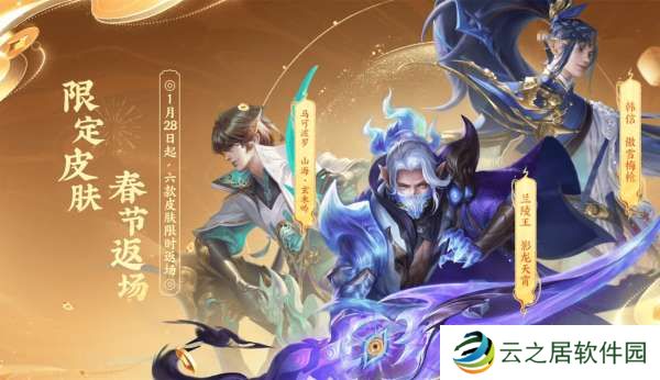 新春返场的皮肤一共有6款,马可波罗的玄木吟,韩信的傲雪梅枪,兰陵王的影龙天霄,张飞/刘备的百相守梦,不知火舞的绯月行。