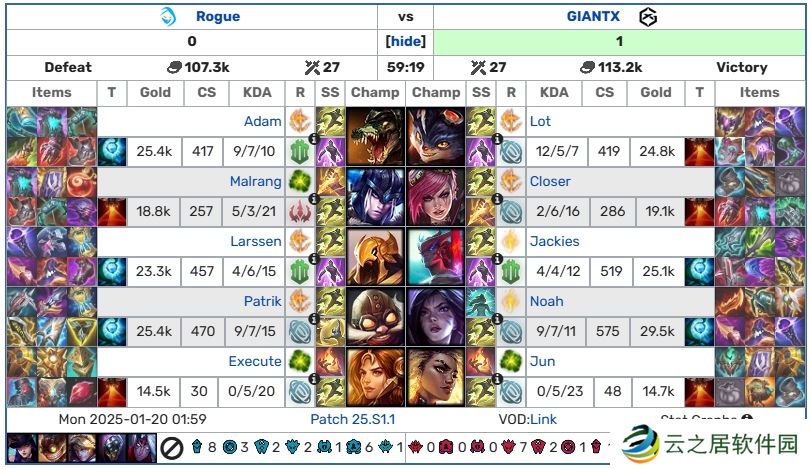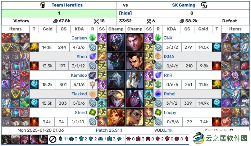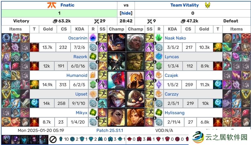 直播吧01月20日讯 2025LEC冬季赛第一周第二个比赛日结束;五场Bo1的具体赛果计分板如下: