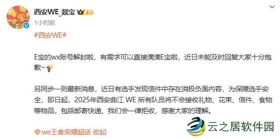 另同步一则最新消息,近日有选手发现信件中存在消极负面内容,为保障选手安全,即日起,2025年西安曲江 WE 所有队员将不会接收礼物、花束、信件、食物等物品,包括邮寄快递,我们会一律拒收,感谢大家的理解。