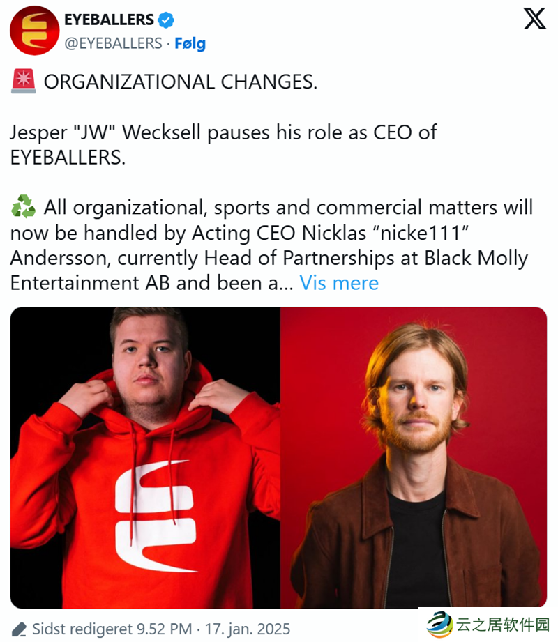 周五下午,JW所在的EYEBALLERS战队在社交平台发文,公开宣布这位瑞典选手将暂时辞去战队首席执行官的职务。这一职位将由EYEBALLERS成员nicke111接任。