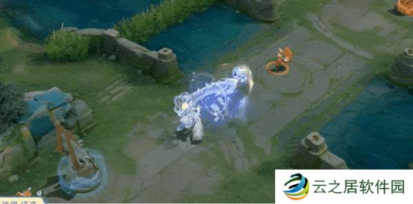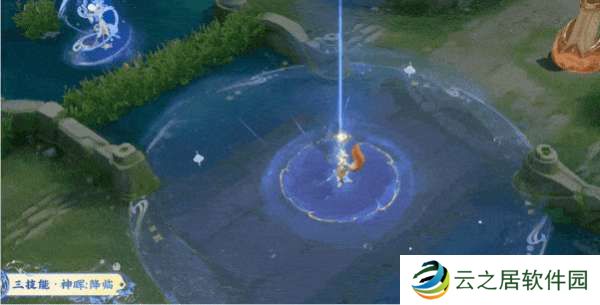 女娲传送时浮现星河,传送点上方灵蛇从天而降,落地灵池激起水涡纹样。