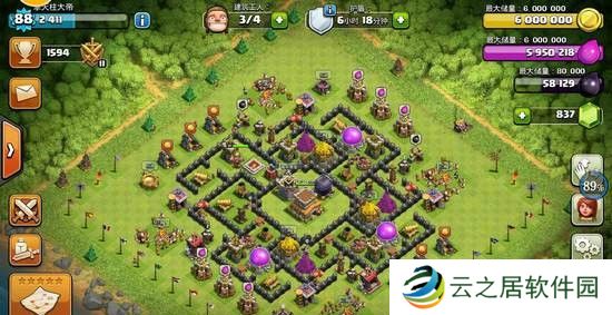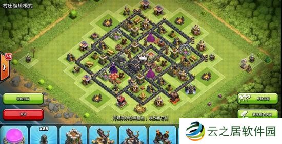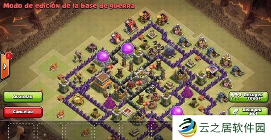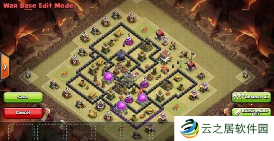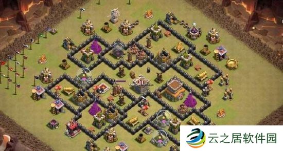 中间连炸防野猪,尤其防龙,可能看不出来,但是防龙效果相当显著,缺陷是害怕石猪,这张可也当作部落战阵型,冲杯阵型,把黑水罐和部落城堡换下位置就是护资源阵型。
