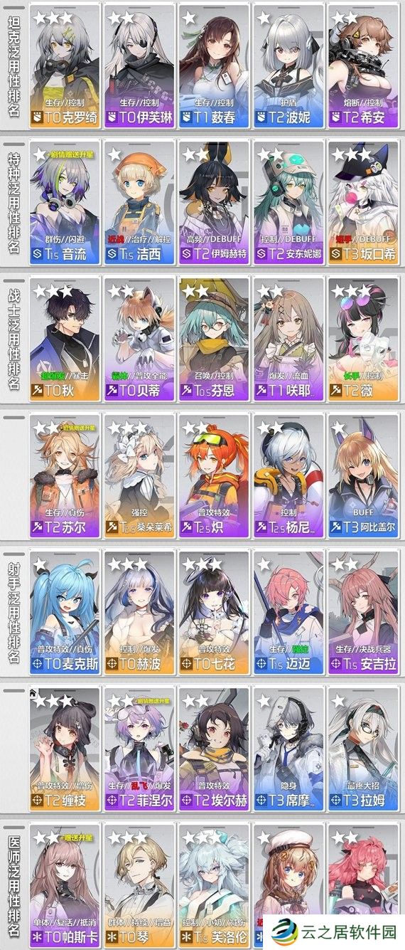 游戏汇总角色有不同定位,包括坦克、特种、战士、射手和医师。每个位置的强度榜如上,大家可以来参考一下哦。大家也不不一定要完全按照上表,喜欢其他角色也可以培养。