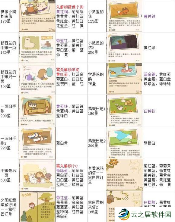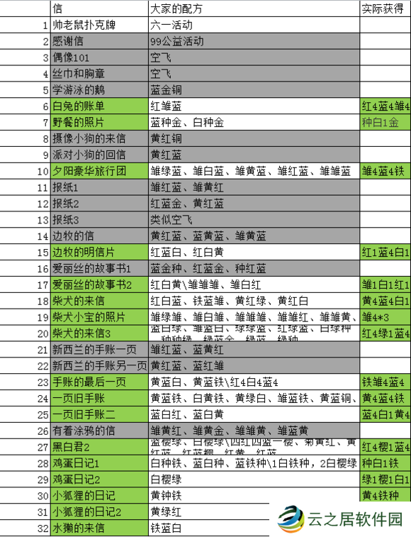 目前个人已知全信件,红色字体为必须条件,紫色字体为自己获取并记录的。此为玄学,不是全部,也并非一定能获取,可以多次尝试。个人经验,花花等级无影响,摆放顺序无影响。
