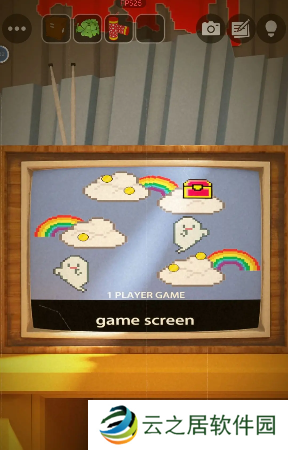 18、把卡带放到游戏机里,出现游戏画面,按照宝箱–1,幽灵–2,彩虹–3,云朵–4,金币–5的顺序解开迷题,获得粉笔。