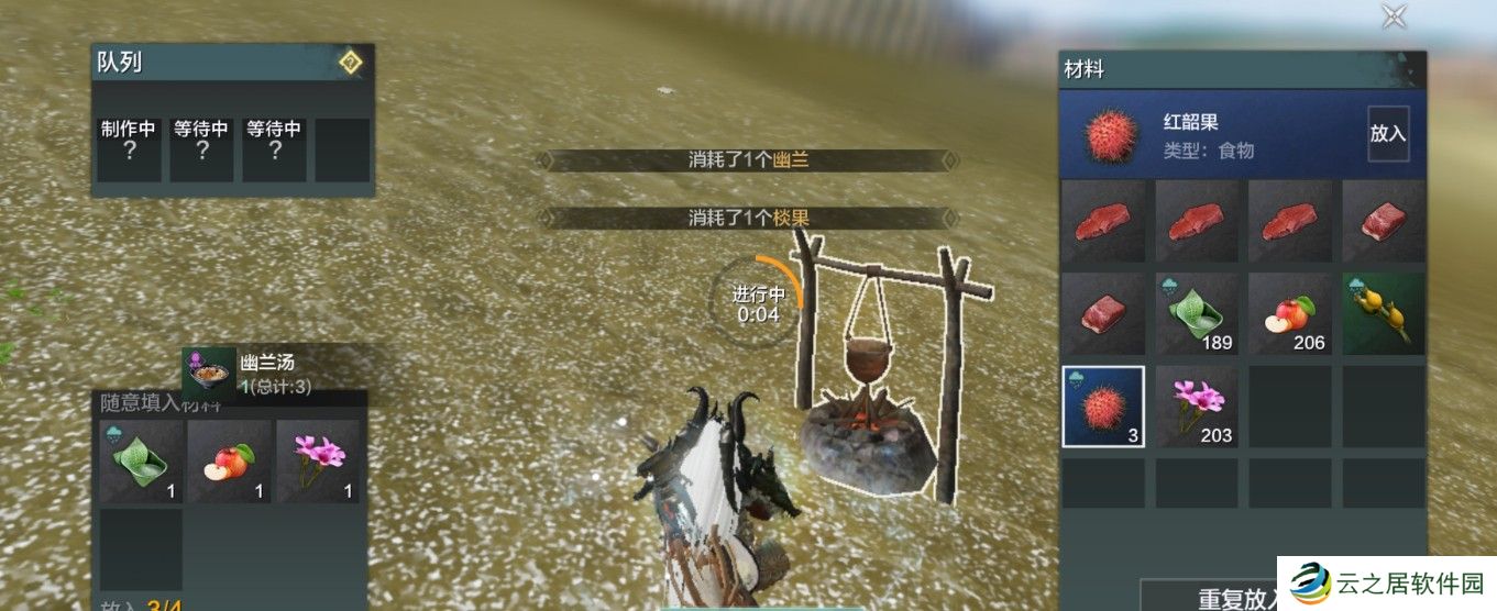 在妄想山海手游中,玩家可以在篝火处,使用露水+苹果+幽兰花,几率制作获得幽兰汤。幽兰花在地图上随机刷新,很容易采集获得。食用增加180点饱食度和少量凝神,完全食用后15秒内回复500生命,并获得少许灵气,可喂给宠物增加饱食度和灵气。