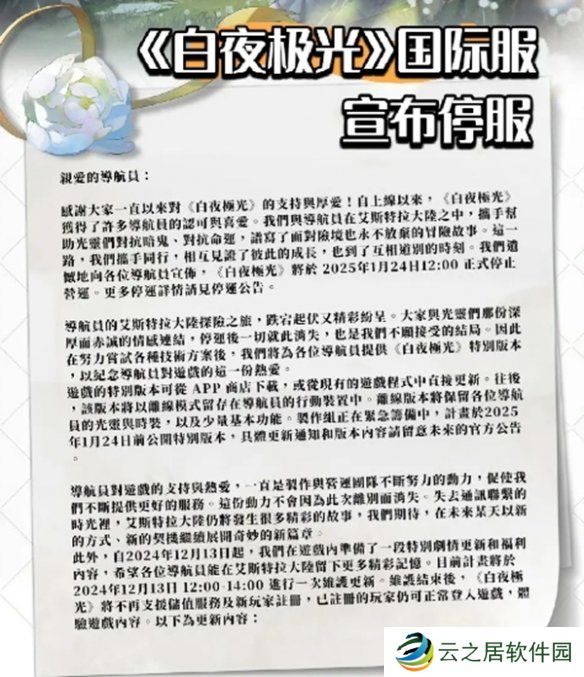 以上就是小编为大家带来的白夜极光国际服停服时间,希望能对你有所帮助,想要获取更多游戏相关攻略请关注游戏部落手游。