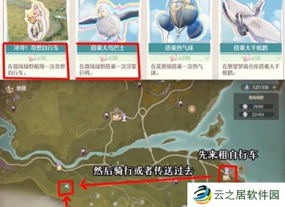 1、首先去租借一辆自行车,然后骑行或传送到浮絮巨鸥的巢穴。