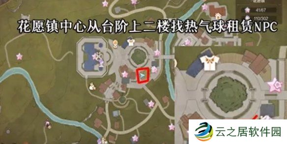 3、花园镇中心从台阶上二楼找热气球租借NPC。