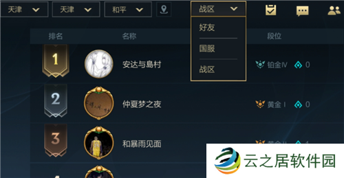 战区排行榜会显示你当前所在地区的段位排行,而且你还可以自由切换各个地区来查看,不过默认的是你所在地,因此大家想要查看自己的战区排行榜也就很方便了。总而言之,查看排行榜在最上面,可以自己切换,有三个选项,其中一个就是战区排行榜,也就是大家要找的地区排行榜。