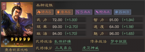 曹操被称为战略版的万金油。具有许多优点:骑兵、盾兵两S级兵种适应性和高统率成长,辅助、奶、肉控制等。曹操自带指挥战法乱世奸雄,战斗中对2名友军提高伤害,对自己降低伤害。做主将的时候,副将给予伤害的话,曹操一定的兵力就会恢复。曹操的自带战法非常适合肉盾,不仅能提高友军的伤害,还能降低自己受到的伤害,对受伤的耐受性和辅助能力也很优秀。在担任队长期间,曹操变得更加肉,通过副将的输出恢复兵力,可以给曹操承受更大的伤害。