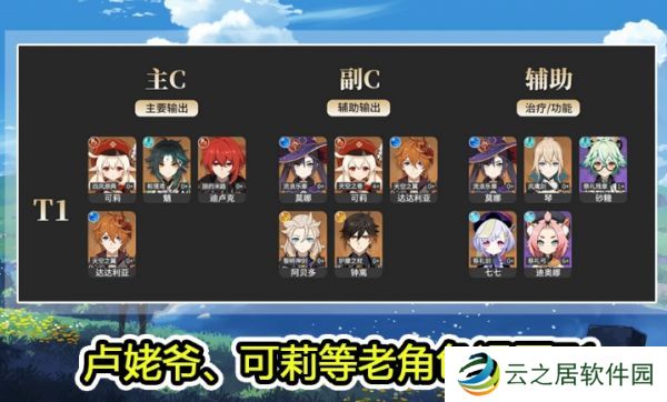 然后是T1级别的角色,大家可以看到,大部分老的五星角色都出现在了T1级别之中,包括可莉、卢姥爷、公子、琴团长等等。