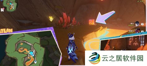 14、进入下图的洞窟中,跳下去来到岩浆湖旁,附身龙伙伴,启动左手边的机关开门。