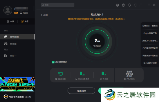 5、下载奇游加速器,尝试更换节点,笔者亲测总能最大程度降低网络和配合给下载、安装、联机过程带来的影响,非常好用: