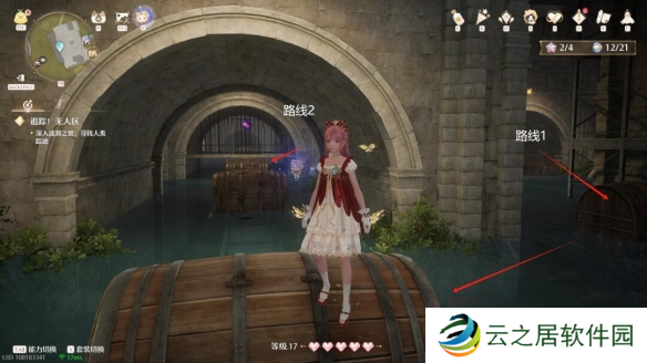 10、跳到水中的大木桶上,注意收集两侧的灵感露珠,此处可得5个灵感露珠。