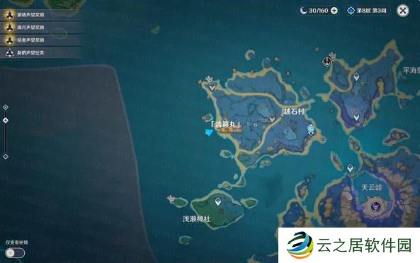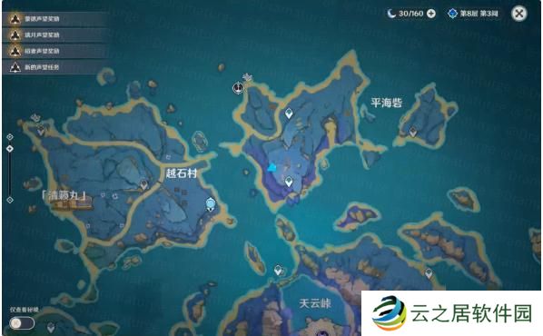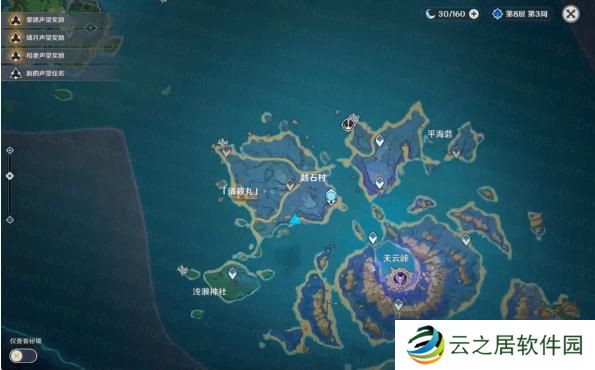 在清籁岛如图所示位置进行挖掘。4.任务流程(1)询问冒险家。(2)询问太田太郎。(3)前往清籁岛,拍摄画片。四处画片位置如下:*使用【派蒙菜单】→【拍照】功能进行拍摄。画片1