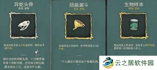 H、三个遗物对毒猎的提升都比较大,生物样本面对多个敌人时,毒可以传播。
