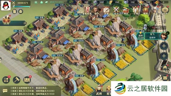 游戏中的资源建筑主要是木工坊(木材),石料坊(石料),农田(粮食)以及民居(银币)。