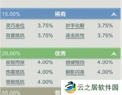 3、稀有—双重抵抗,普攻抗性和持续伤害抗性、连击抗性,技能伤抗+持续伤害抗性。