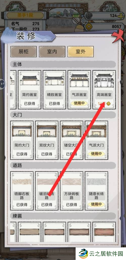 2、接着,在展开的装修界面中,挑选“室外装修”选项,然后在主建筑物列表里寻觅那间高雅的画室。