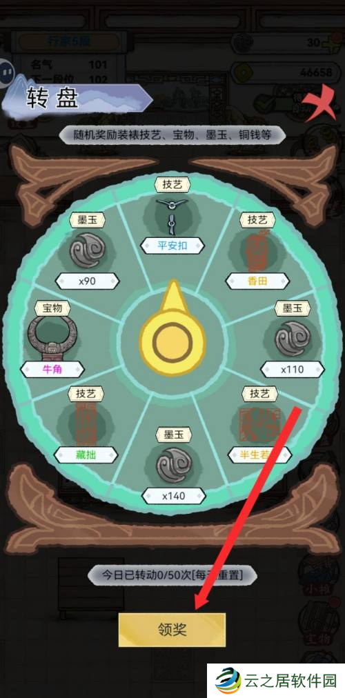 2、进入转盘抽奖区域后,请点击页面底部的“领取”按钮。每天最多可以领取50次,有机会随机得到装裱技能。