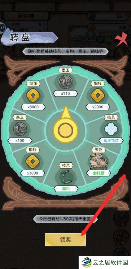 2、在转盘的奖品展示区,你可以发现随机奖励涵盖了墨玉、技能点以及金元宝等多种物品。