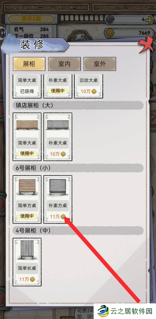 2、进入装修界面后,请点击“展柜”选项,并向下滑动直至找到编号为6的展柜。在此,您会看到“朴素方桌”,点击它以查看更多详情。