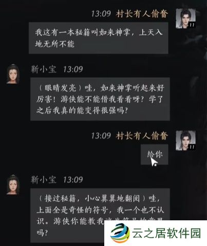 下图示例中我们捏造了**神掌和书(不需要实物),然后忽悠一下他即可。当然如果你比较诚实,那就说教他自带的无名剑法也行(如果靳小宝问地点时间就说现在当下即可)。