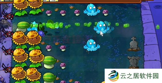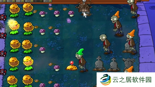 2、先在左侧补充两个向日葵,在一路种植三个喷菇投手。
