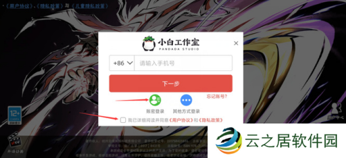 2、在随后打开的窗口里,阅读并同意位于页脚的用户协议,随后在页面右侧选择账密登录。