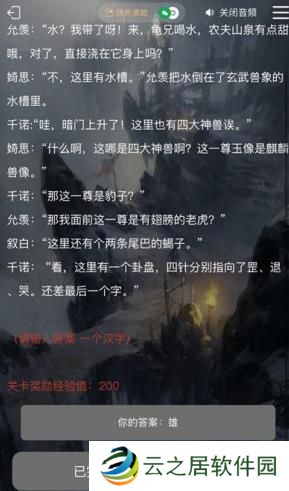 第一个字为方向,青龙对东,朱雀对南,白虎对西,玄武对北。则第一个字为北。第二次为四大神兽,差玄武,青龙取龙,朱雀取雀,白虎取虎,玄武取武字,故第二个字为武。第三个字为对应五行,青龙对东,五行对木,三木为森。朱雀对南,五行对火,三火为焱。白虎对西,五行对金,三金为鑫。玄武对北,五行对水,三水为淼。故答案为北武淼。