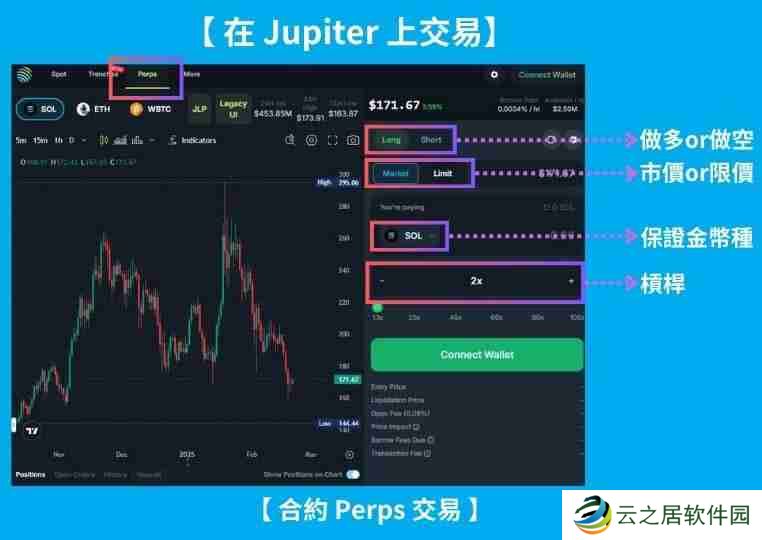 4. Perps 永续合约: Jupiter提供SOL、ETH、WBTC等永续合约,杠杆范围1.1x – 100x,并支持使用Solana生态内代币作为保证金。