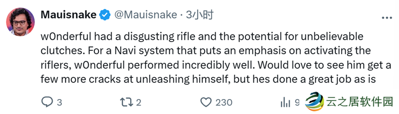 Mauisnake:w0nderful步枪很强,而且具备在关键时刻创造惊人残局的潜力。对于注重发挥步枪手作用的NAVI体系而言,w0nderful的表现堪称惊艳。很希望看到他能有更多机会尽情施展身手,不过就目前来看,他已经做得相当出色了。
