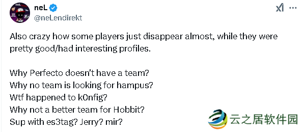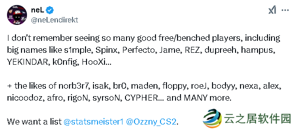 “我不记得什么时候见过这么多优秀的自由或是替补选手了,包括像s1mple、Spinx、Perfecto、Jame、REZ、dupreeh、hampus、YEKINDAR、k0nfig、HooXi等大牌选手……以及n0rb3r7、isak、br0、Maden、floppy、roeJ、bodyy、nexa、alex、nicoodoz、afro、rigoN、syrsoN、CYPHER......以及更多其他优秀的选手。我们需要一份名单。”