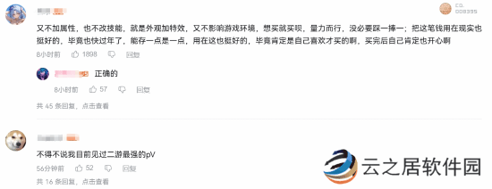 有玩家表示理解这种纯外观向的收费模式:“又不加属性,也不改技能,就是外观加特效,又不影响游戏环境,想买就买呗,量力而行,没必要踩一捧一;把这笔钱用在现实也挺好的,毕竟也快过年了,能存一点是一点,用在这也挺好的,毕竟肯定是自己喜欢才买的啊,买完后自己肯定也开心啊”。